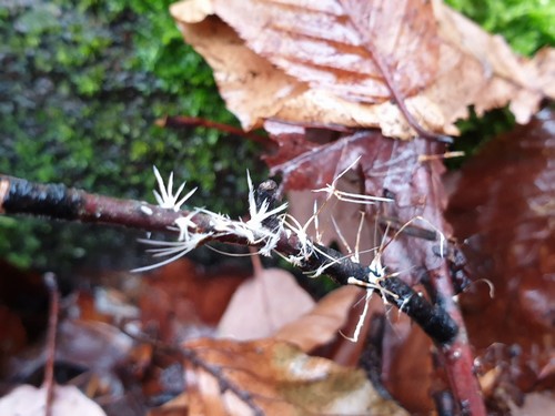 Spindelige, weisse, zugespitzte bis 1cm lange fädige Fruchtkörper. Gruppenweisse aus einer filzigen Basis entspringend. Die Hyphen sind steril. Aus den Härchen entspringen seitlich Härchen.