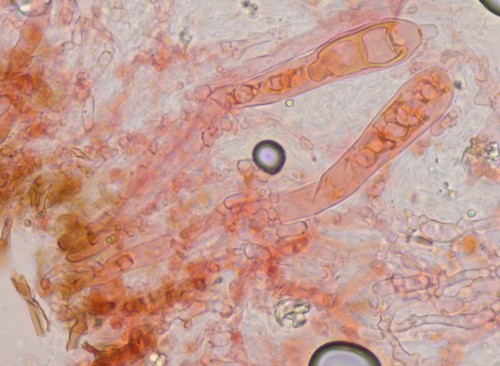 Gloeozystiden mit gelblichem Inhalt, sehr lang bis 150 µm. Einzelne Gloeozystiden sind wesentlich länger als die in der Literatur angegebenen 60 - 100 µm und auffällig bei diesem Fund sind die allantoiden Sporen. Das wohl wichtigste Merkmal sind die typischen Sphaerozysten.