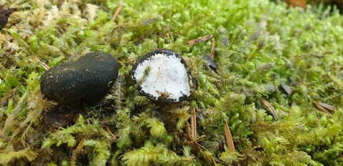 Bei der stiellosen vielgestaltigen Holzkeule sind die Perithezien um einen weissen Kern herum angesiedelt.