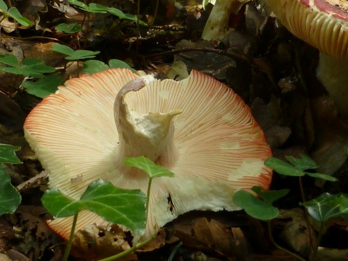 Ziemlich dicke brüchige Lamellen, rosa Schneiden, speziell am Hutrand