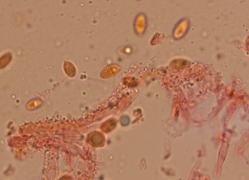 Mycena adescens (fusiforme Cheilozystiden) und kugelige Elemente in der HDS mit warzigen Auswüchsen